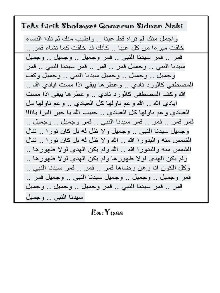 wa ajmaluminka lam taro qottu 'aiin ب ممن يعك ل عيم تعلممد ال من طعساطء عوأ عيطيع . Lagu sholawat berjudul qomarun berhasil menembus 40 jutaan pengunjung ditengok dari channel youtube official sabyan gambus. Lagu qomarun adalah salah satu sholawat kepada nabi saw yang dipopulerkan musisi mesir bernama mustafa atef pada tahun 2014. Lirik dan arti lagu qomarun dari sabyan gambus, pujian untuk nabi muhammad saw: Teks lirik lagu sholawat qomarun, lengkap dalam tulisan arab, latin dan juga arti terjemahannya.